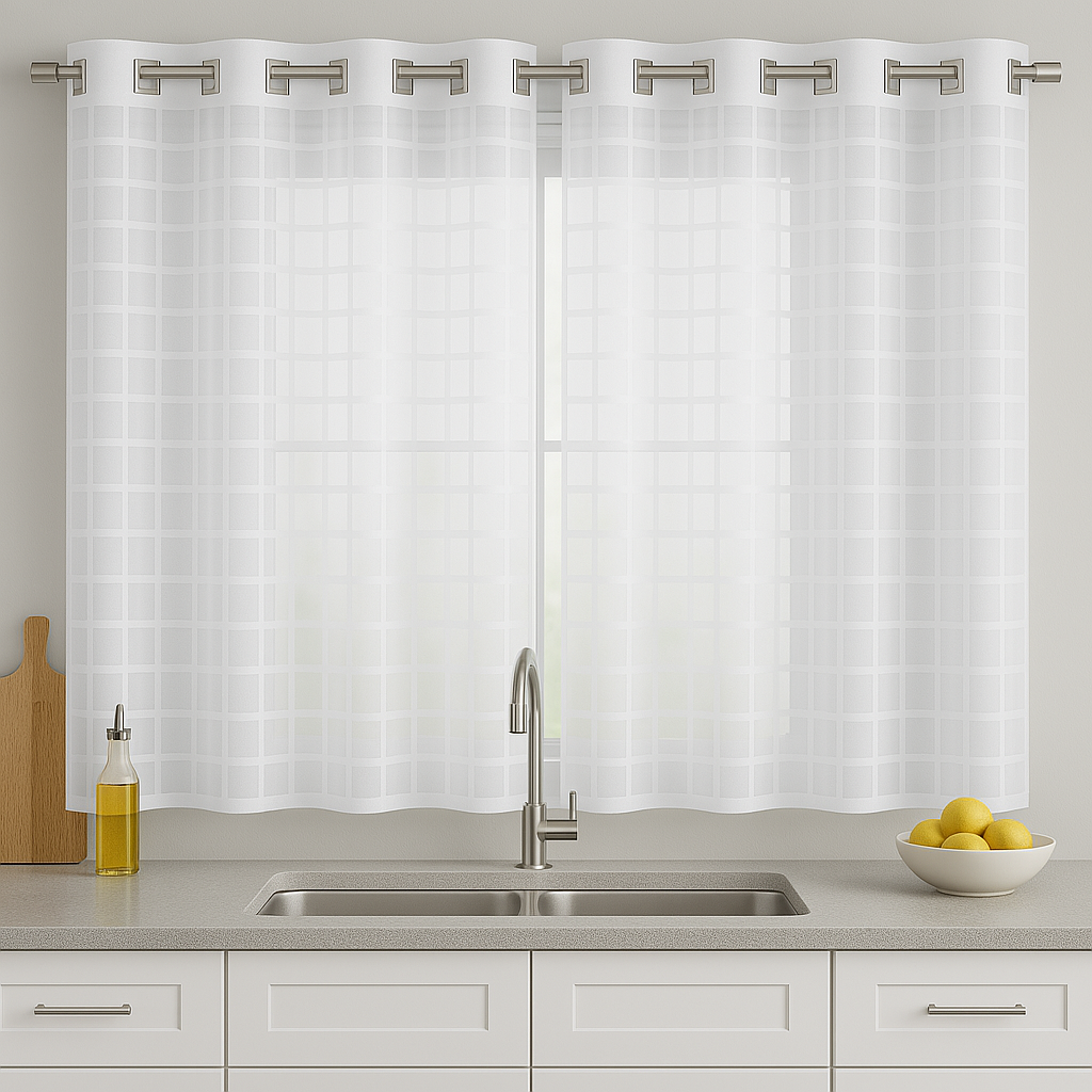 Cortina Cozinha Voil Xadrez Branco 3,00m x 1,20m – Ilhós Quadrado Cromado